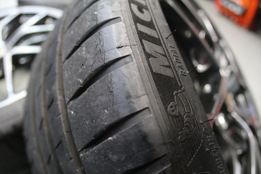 タイヤは溝自体はまだ残っていましたが、フロントショルダー部分にひび割れが見られたため、