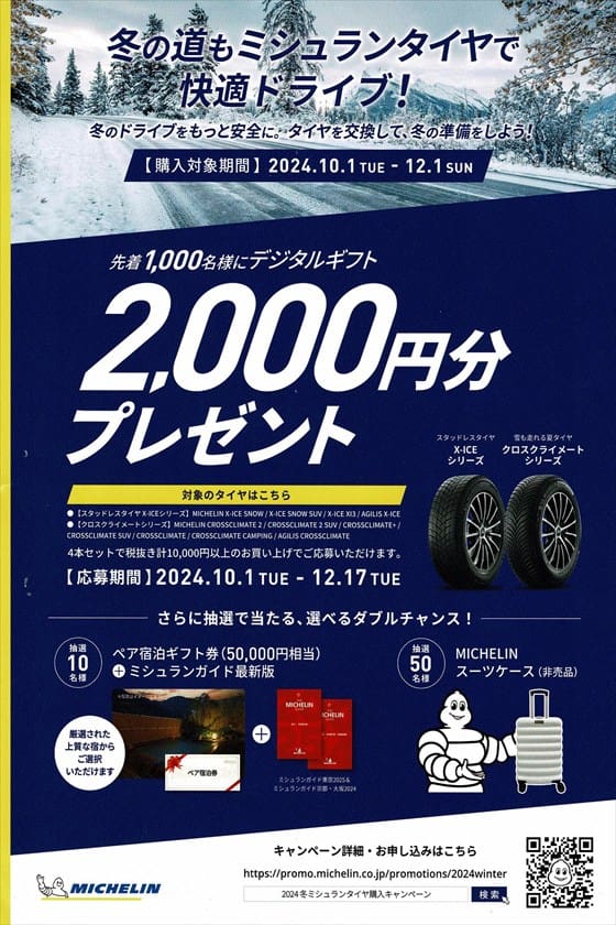 只今、ミシュランのスタッドレスタイヤをお買い上げの方には、デジタルギフト