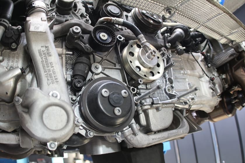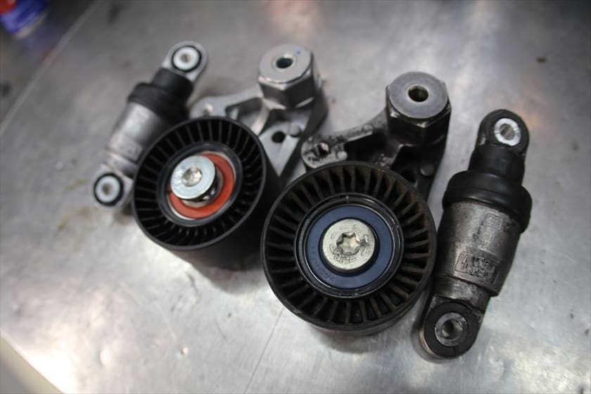 点検を進める中で、ベルトテンショナー周りにオイルの付着とガタを確認しました。