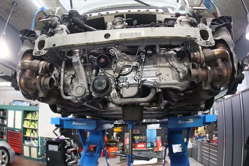 この作業はバンパーやマフラー、メンバーにエンジンマウントなどの脱着が必要なため、