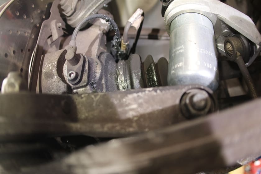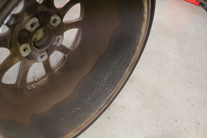 さらに点検を進めると、ドライブシャフトブーツが破れてグリスがホイール内側に飛散。