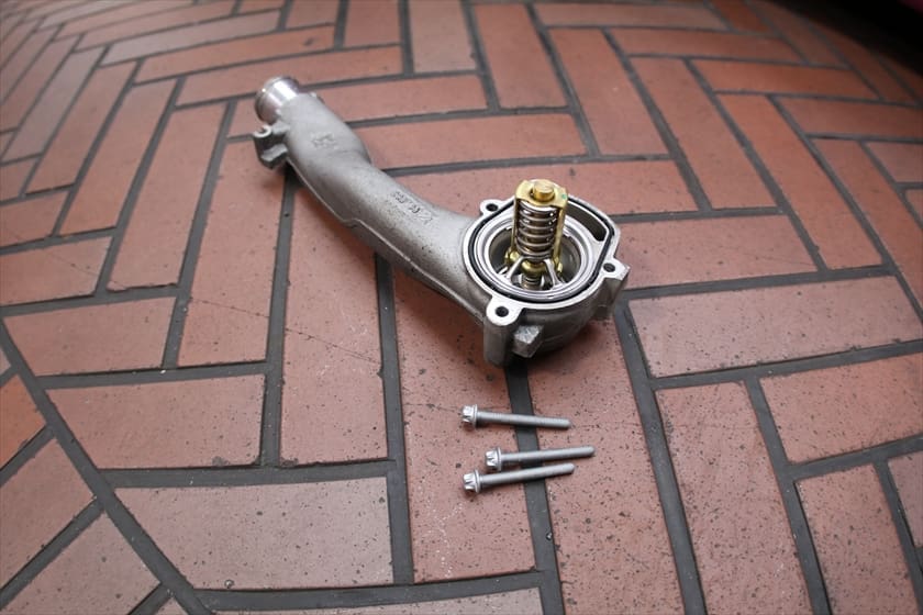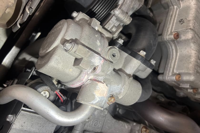 点検したところ、サーモスタットハウジングからの漏れを確認