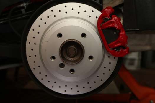 フロントに合わせリアローターもドリルド加工し、キャリパーもペイント。