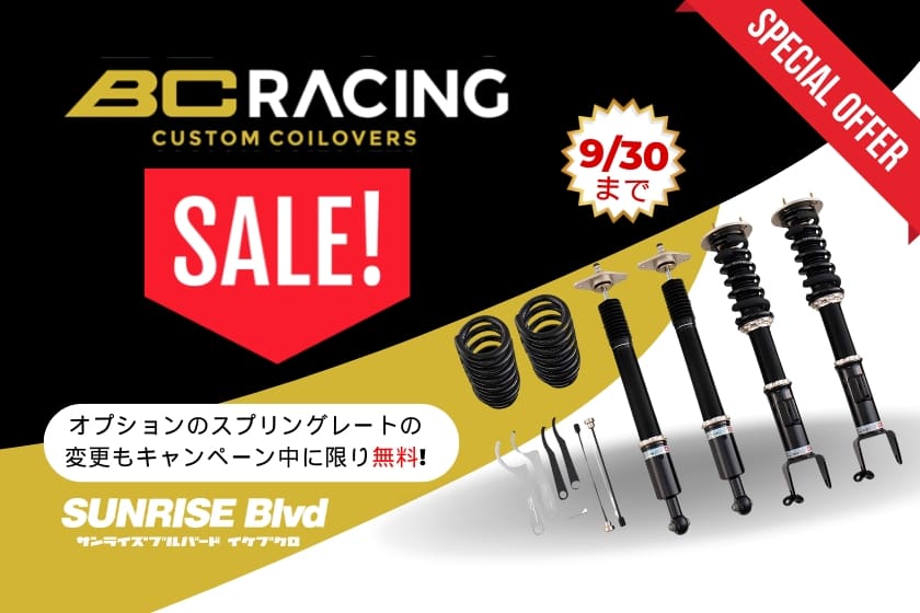 ~9/30まで BC RACINGのサスペンションKITをスペシャルプライスにてご提供させて頂きます。オプションのスプリングレートの変更もキャンペーン中は無料で対応させて頂きます。是非、この機会をお見逃しなく!取付、車高調整、セッティング、アライメント調整も行います。遠方の方は通販でも対応可能です。詳しくはお問い合わせ下さい。