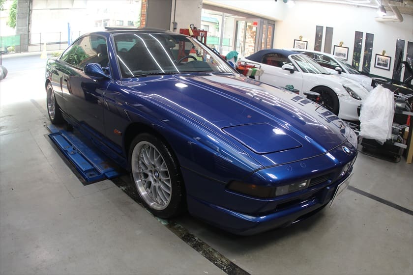 昔からのお客様がレトロブームに乗ってか?(笑)BMW E31を購入されタイヤ交換で入庫しました。